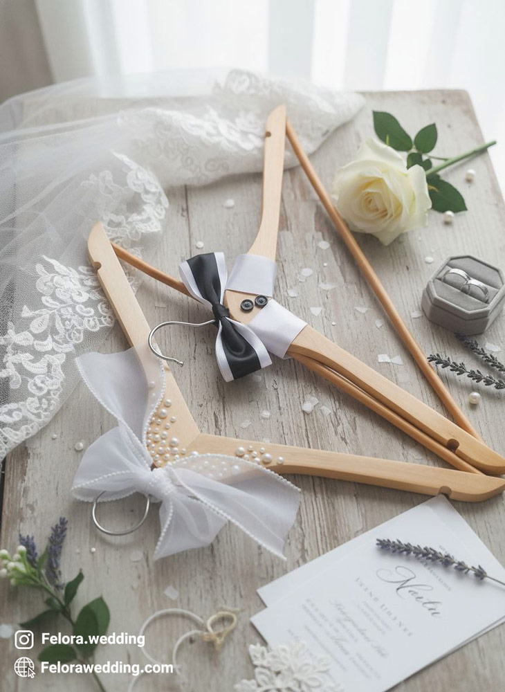 این هنگرهای چوبی و زیبا، با روبانها و گلهای دستساز، برای لباسهای عروس و داماد طراحی شدن. نه تنها کاربردیاند، بلکه به عنوان یک یادگاری خاص از روز عروسی هم میتونن بمانن.